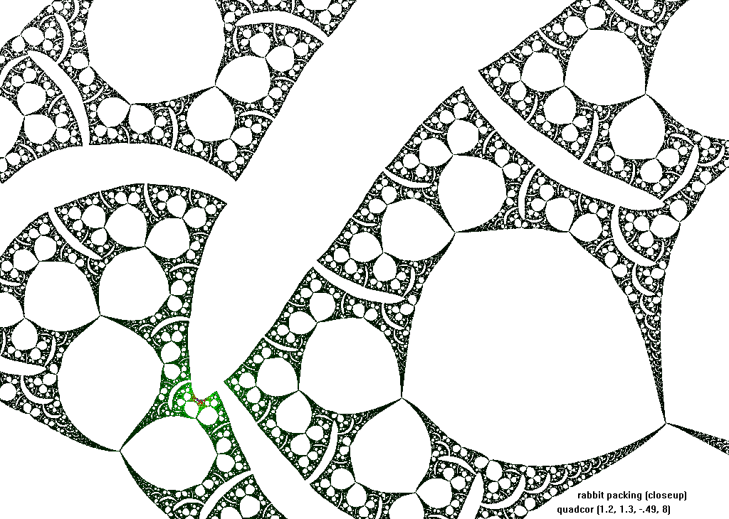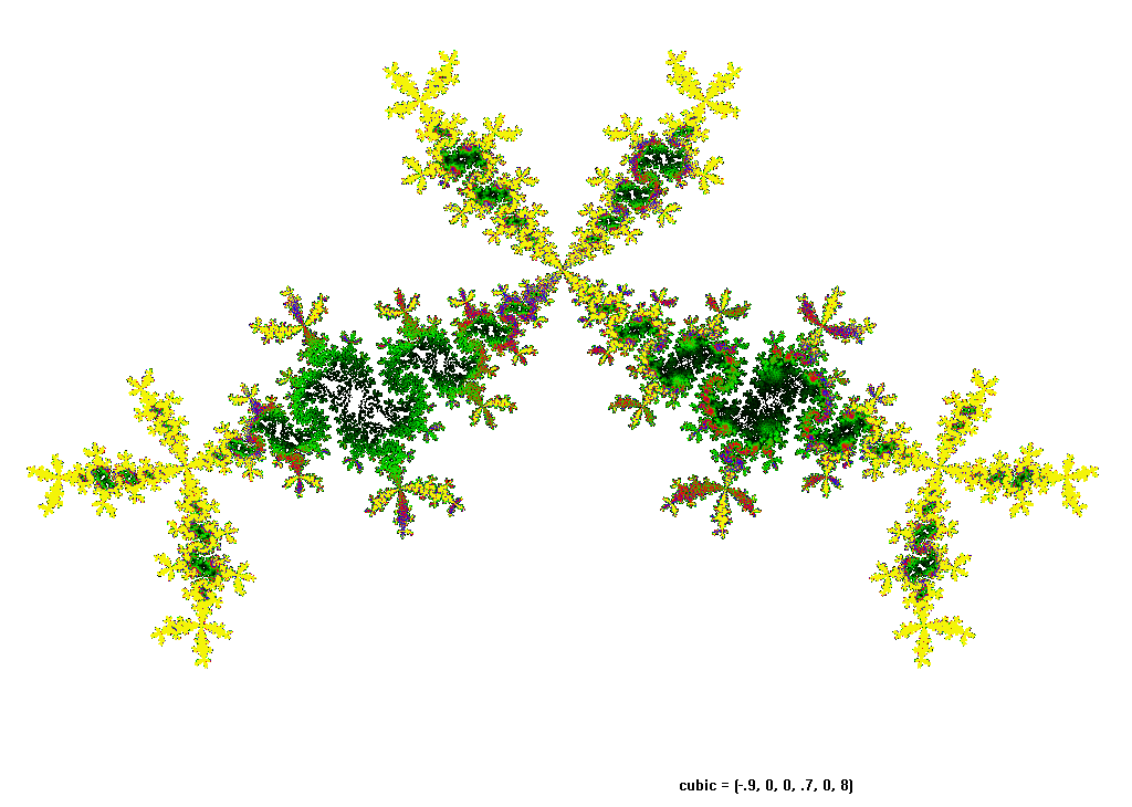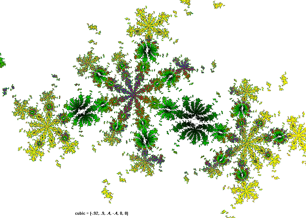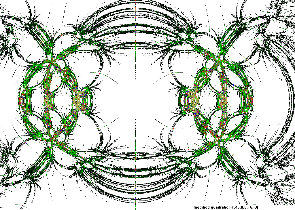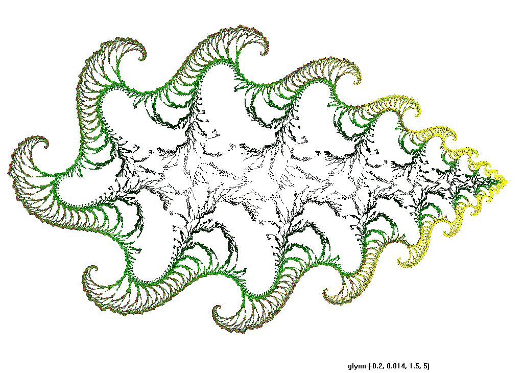 The rendering method used is in spirit the same as that popularized by Barnsley for his IFS fractals. Many of the images have color which indicates the number of times the algorithm visited a given region. Black indicates a few hits, green some more, and red and yellow indicate many hits. Like photography, the images you get depend on exposure time and filters. The series of images presented here are more like polaroid snapshots than serious attempts at creating high quality pictures.