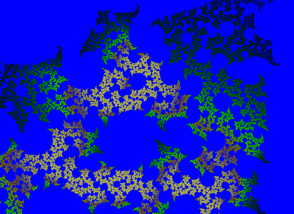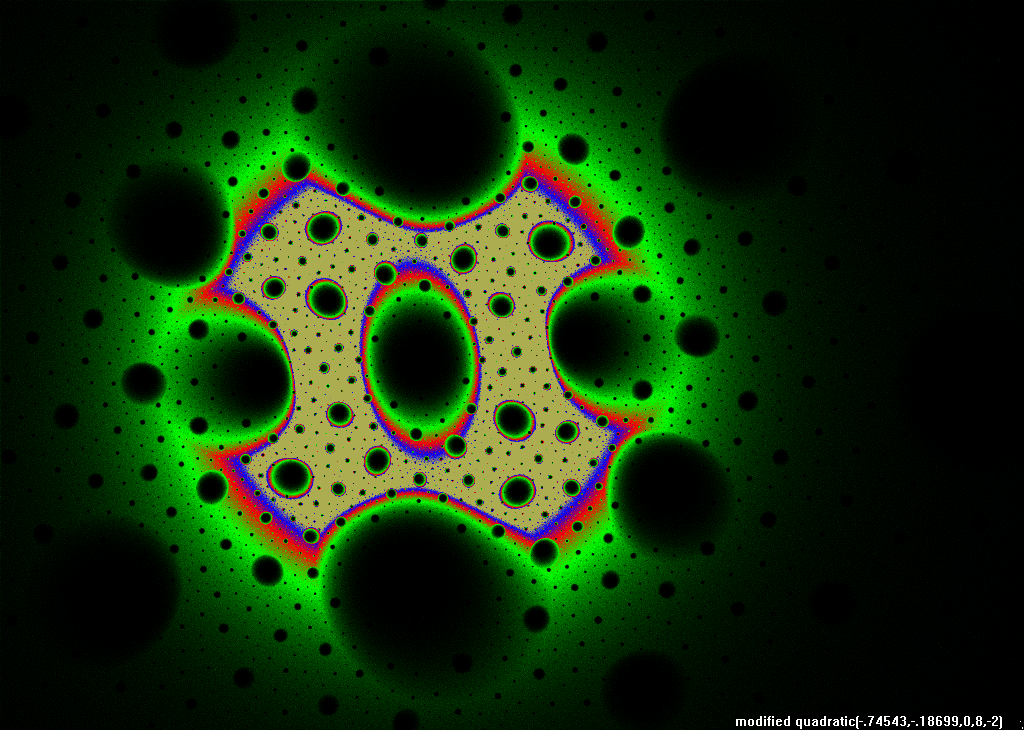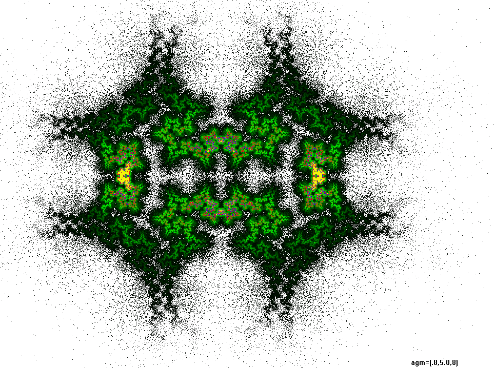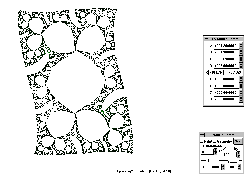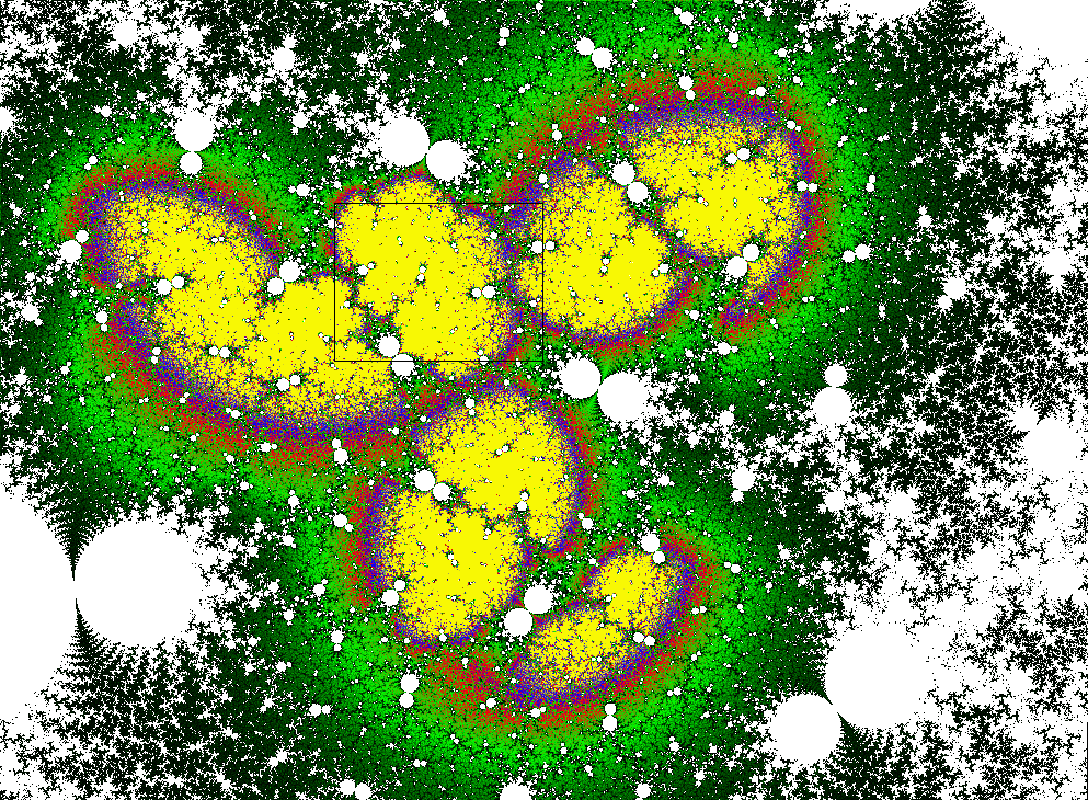 The rendering method used is in spirit the same as that popularized by Barnsley for his IFS fractals. Many of the images have color which indicates the number of times the algorithm visited a given region. Black indicates a few hits, green some more, and red and yellow indicate many hits. Like photography, the images you get depend on exposure time and filters. The series of images presented here are more like polaroid snapshots than serious attempts at creating high quality pictures.